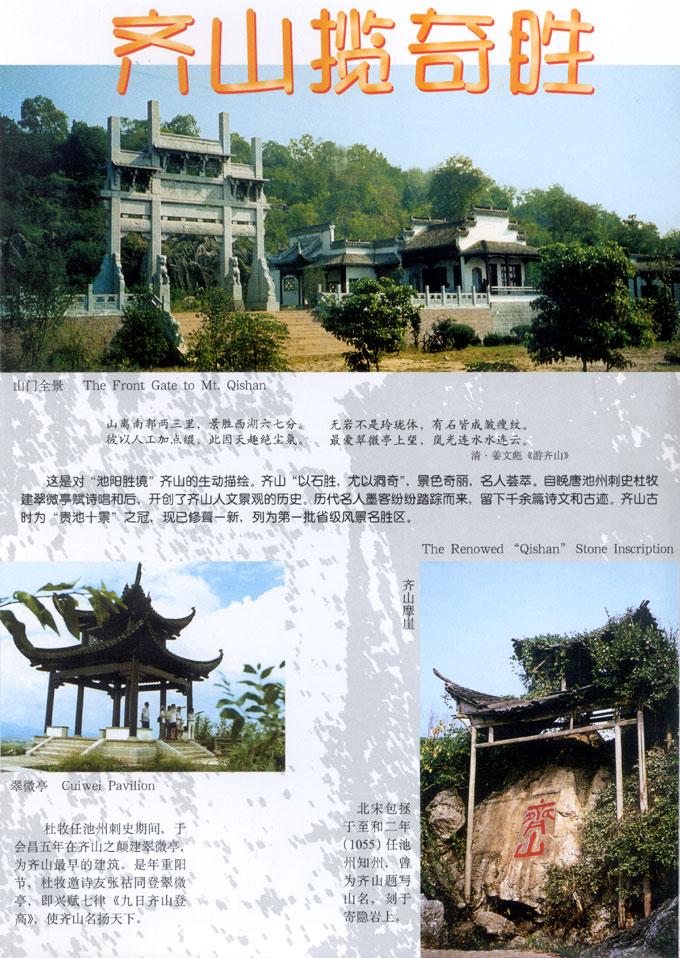 齐山-平天湖风景区位于安徽省池州市城区,规划面积40.6平方公里,由齐山景区、碧山景区、平天湖景区、湿地景区、桃源景区五部分组成,集山、水、湿地于一体,自然景色优美,人文积淀深厚。景区南连九华圣地,西接秋浦仙境,与池州古城、杏花村风景区鼎足相望,是山水文化的缩影,构筑了池州典型的“山水在城中”的特色景观。